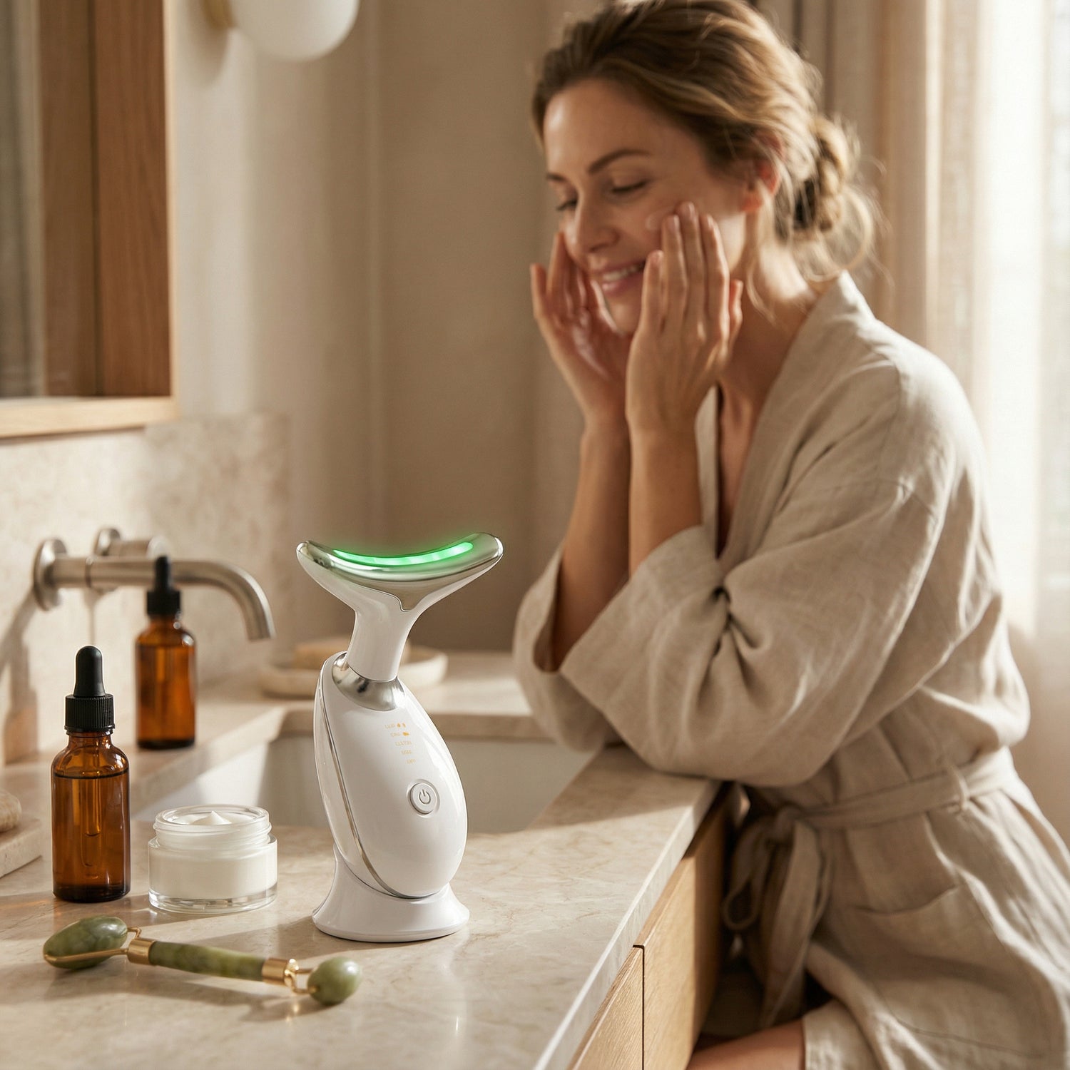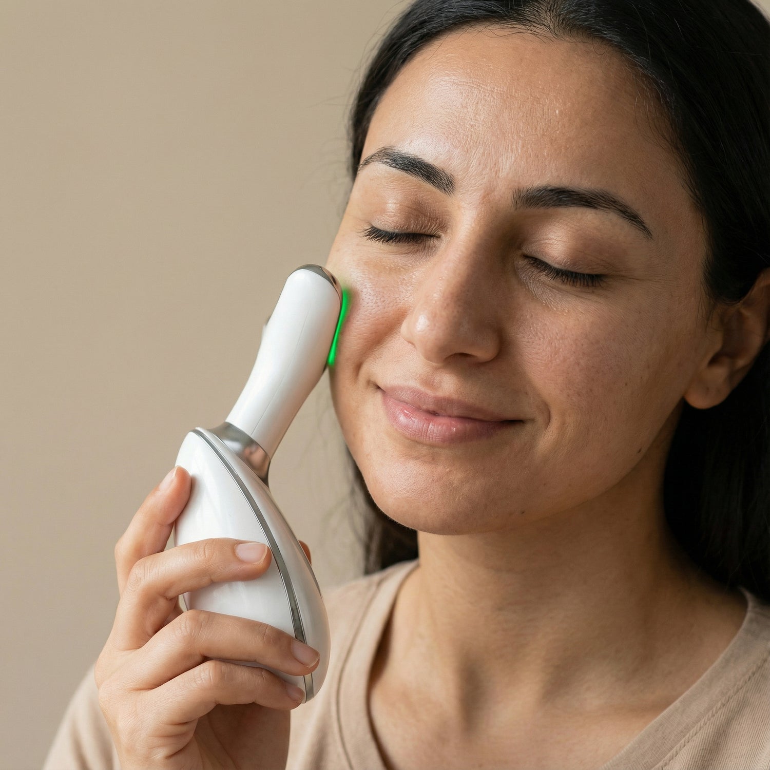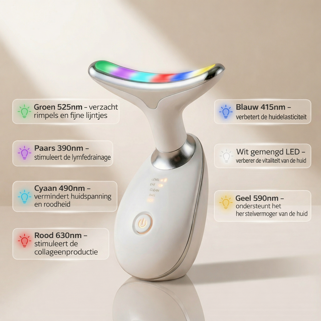 ZynraSkin™ Pro uses professional multi-LED light technology combined with gentle massage to stimulate the skin, boost radiance, and reduce the appearance of fine lines. The light penetrates the skin safely to support a smoother, more youhful-looking complexion.